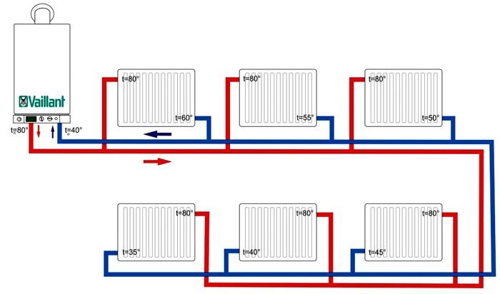 Нека си признаем, не най-добрият вариант, защото има един съществен недостатък. По-отдалечените от котела радиатори приемат охлаждащата течност със значително намалена температура. Тоест, най-близките батерии до котела ще са горещи, отдалечените ще са топли. Това означава, че в някои стаи ще е хладно.