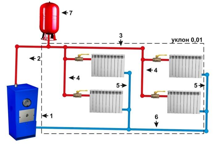 Обърнете внимание на снимката по-горе. Той ясно показва секциите на отоплителната система, където "1" е общата верига, "2" е основният щранг от котела, "3" е хоризонтален участък с наклон, обикновено разположен на тавана. "4" - това са щрангове, които подават охлаждащата течност към радиаторите. "5" - щрангове, които поемат охлаждащата течност от батериите и "6" - това е връщащата линия.