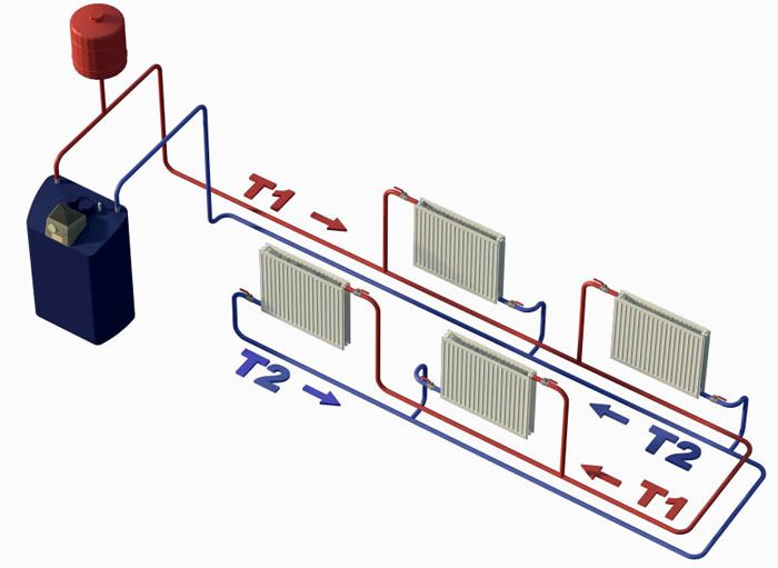 Тази система за инсталиране на вода е по-сложна и използва повече материали. Но работи много по-добре от еднотръбната. Чисто структурно, разположението на тръбите в него се състои от две вериги: захранваща и връщаща. Трябва да се отбележи, че и двата тръбопровода са слепи и са свързани помежду си само чрез радиатори и отоплителен котел. От самите имена става ясно, че отоплителната охлаждаща течност се подава към радиаторите по захранващата верига, а охладената се извежда в котела чрез обратно охлаждане.