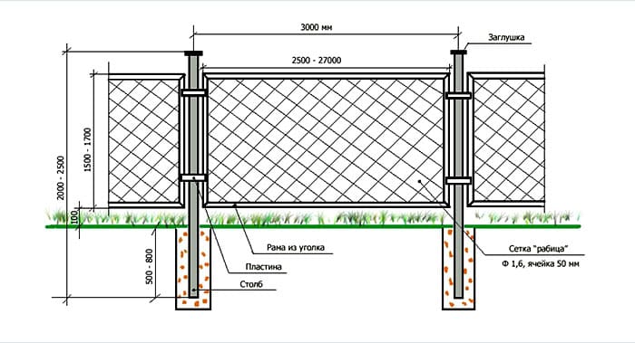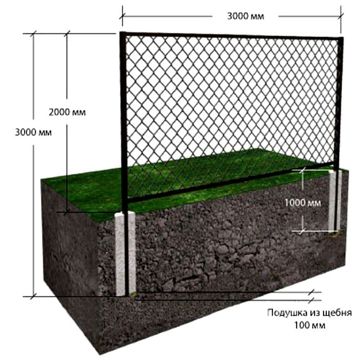 Стандартната височина на оградата от веригата е 1-2 м, а разстоянието между стълбовете се поддържа на 2,5 м.