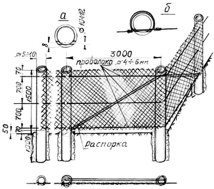 Поради факта, че мрежата все още е тежка, по-добре е да поставите опорите по-дълбоко. Минималната дълбочина е 50 см, оптималната е 1 м. Първо се монтират ъгловите опори, които трябва да бъдат подсилени с дистанционни елементи: те ще предотвратят наклона.