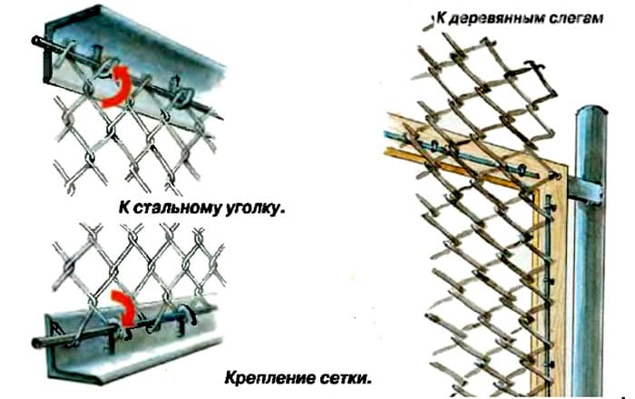 Първо, окото е завързано от единия ръб към ъгловия стълб, а вторият ръб е изтеглен. Ако мрежата провисне, използвайте междинни крепежни елементи.